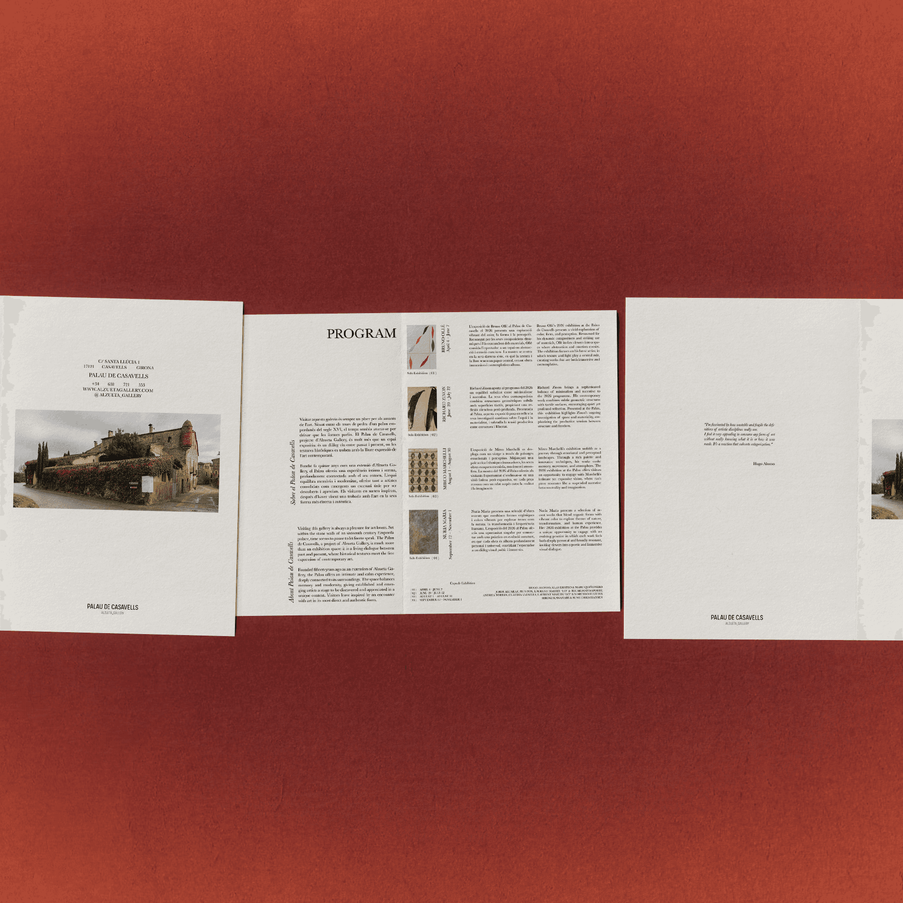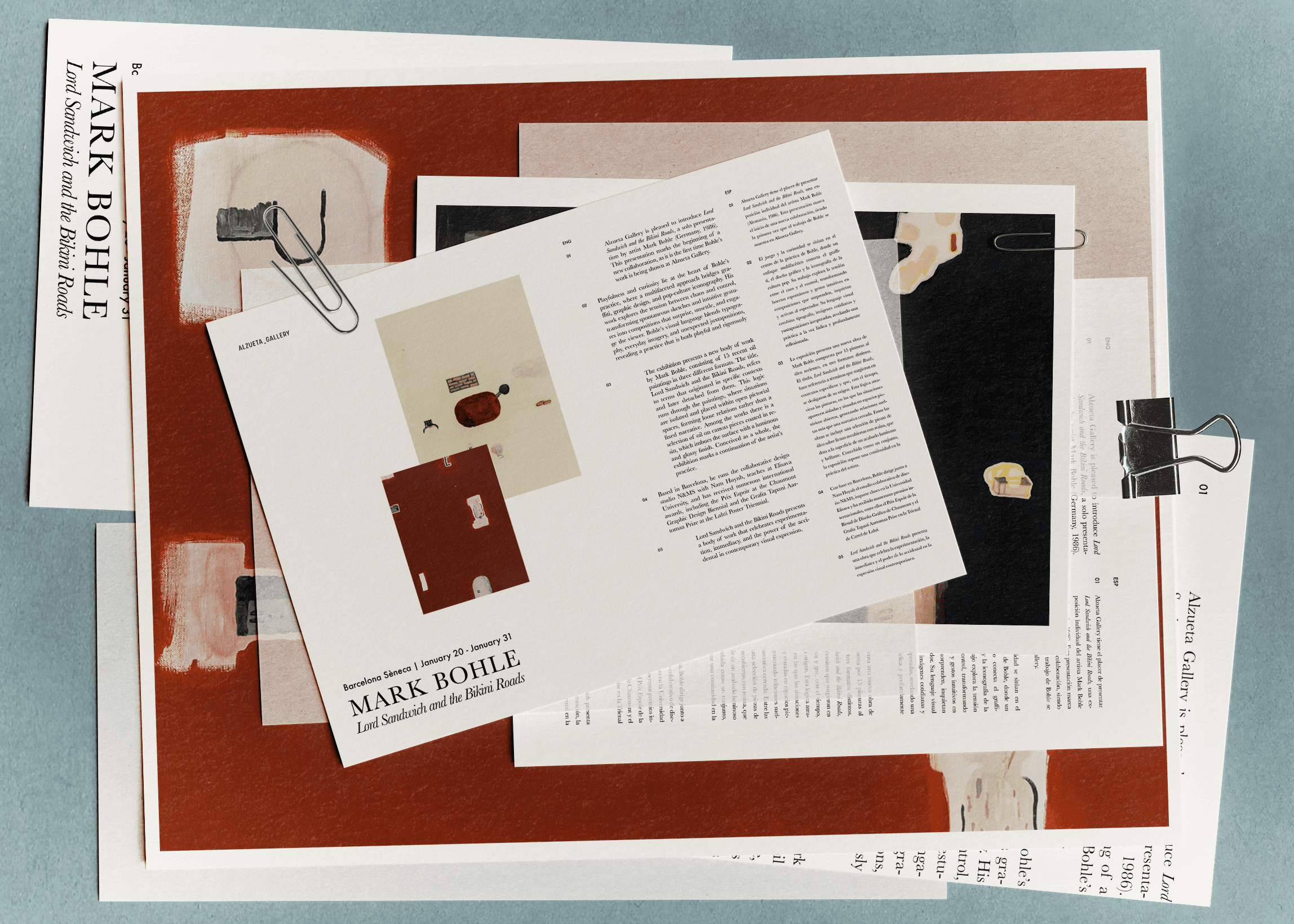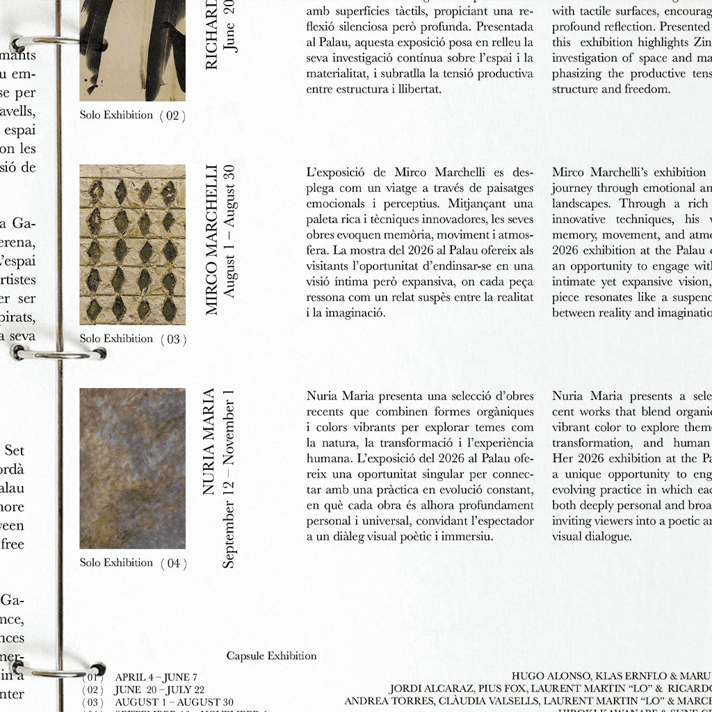 DURING AN INTERNSHIP AT THE CONTEMPORARY ART GALLERY ALZUETA, TASKS INCLUDED PREPARING AND ORGANIZING EXHIBITION CONTENT ACROSS PRINT AND DIGITAL FORMATS. THIS INVOLVED COMPILING EXHIBITION INFORMATION, CREATING PREVIEW DOCUMENTS FOR COLLECTORS, BUYERS, AND PARTNER GALLERIES, AND DEVELOPING HOJA DE SALA TEXTS WITH LAYOUTS TAILORED TO EACH EXHIBITION’S VISUAL LANGUAGE. FURTHER RESPONSIBILITIES COVERED THE CREATION OF SOCIAL MEDIA ASSETS AND ANIMATED CONTENT FOR NEW INSTAGRAM FORMATS, SUPPORTING THE GALLERY’S EXHIBITION COMMUNICATION AND ONLINE PRESENCE.
